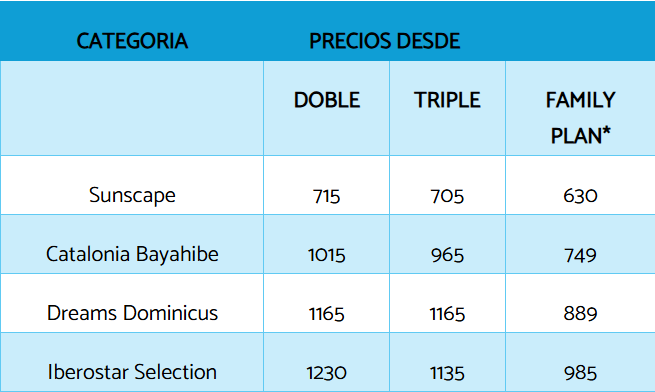 *Condiciones del Family plan: 2 adultos + 2 menores hasta 12 años. El valor publicado es por persona (tomando en cuenta 4 personas por habitación)Consultar por pasajes aéreos y noches adicionales.